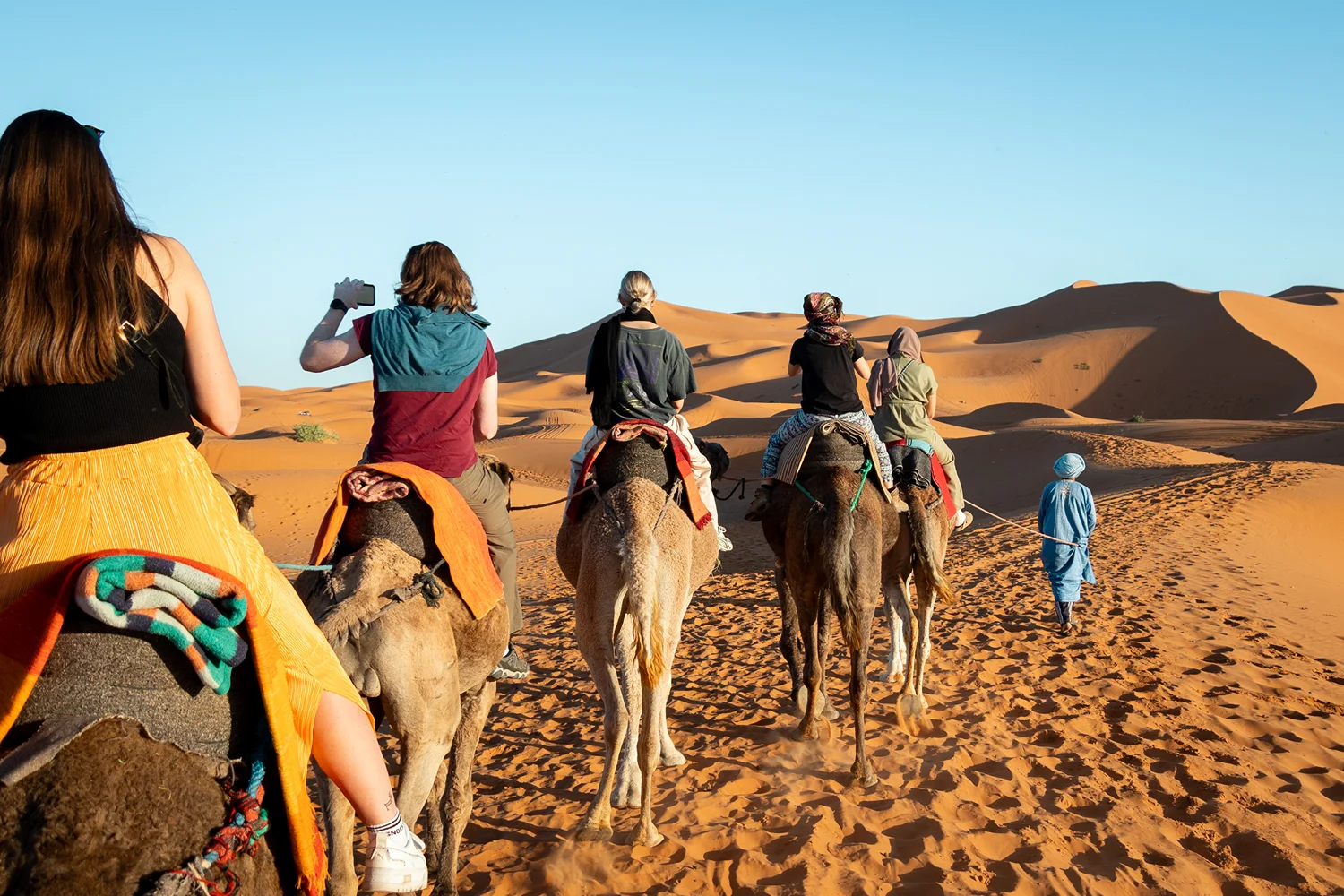 Tourists riding camels through the golden sand dunes of the Sahara Desert near Merzouga