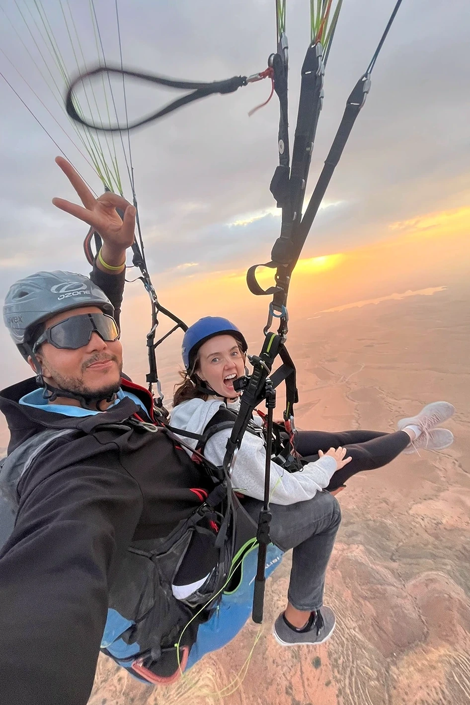 Get ready for an epic mountain adventure! We'll drive to the stunning High Atlas Mountains where you'll visit authentic Berber villages. You'll see their unique traditional homes and learn about their beautiful way of life that's remained unchanged for centuries – it's truly inspiring! Next, we'll continue to the breathtaking Ourika Valley, a peaceful paradise known for its lush green landscapes, crystal-clear flowing rivers, and the freshest mountain air you'll ever breathe. But here's where things get really exciting – in the afternoon, you'll take part in an unforgettable paragliding adventure! You'll glide like an eagle over the spectacular valleys and peaks of the High Atlas Mountains. This is pure adrenaline at its best!